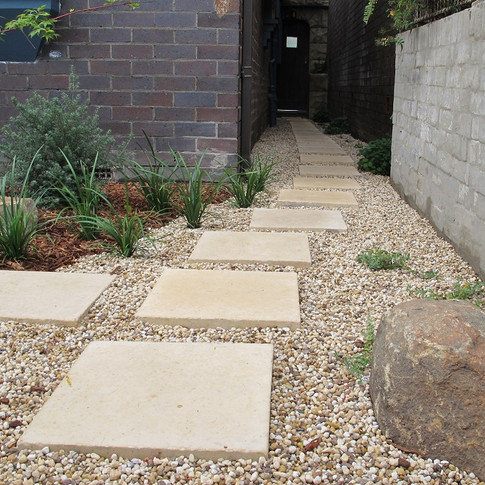 A Philendron has been retained for its unusual habit and trunk, with the pebbles serving to highlight this striking plant. Stepping stones are used in an informal way to navigate the garden and to bring residents down the side of the house, where Native Violets will fill in the ground space and Boston Ivy creep up the walls.